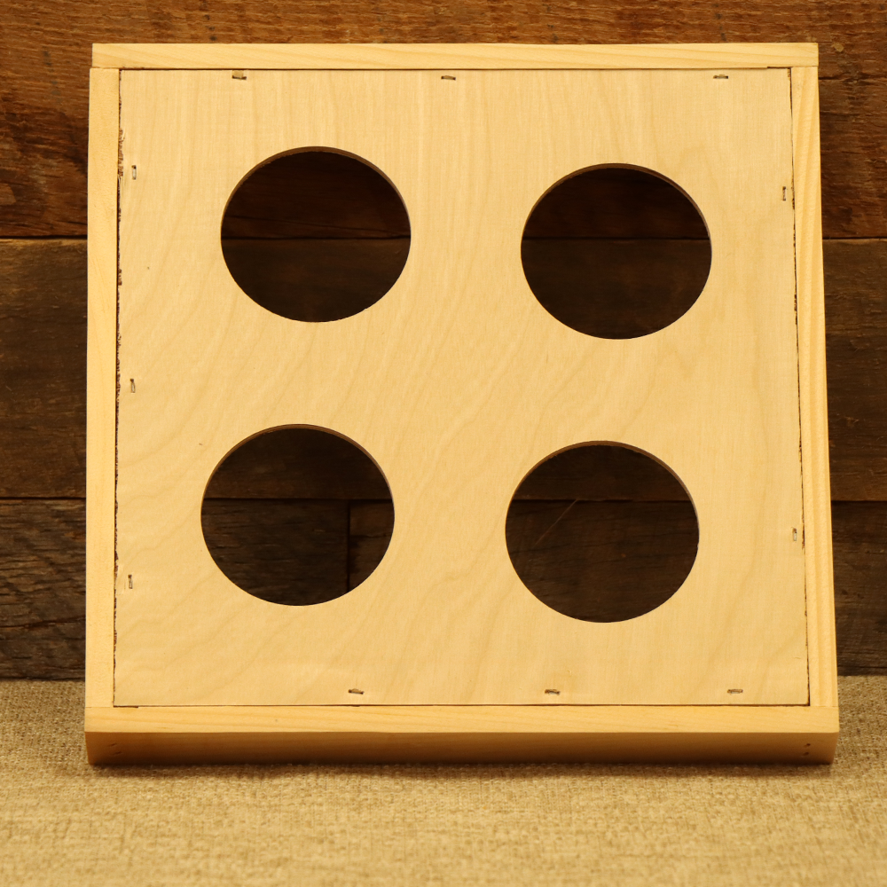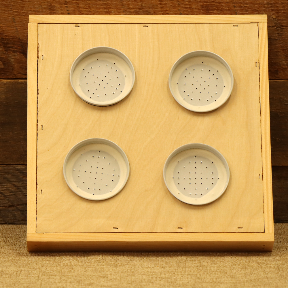 This 4-jar feeder will keep you from having to refill jars every other day when introducing package bees or nucleus colonies. This will also come in handy when trying to get hives up to weight before winter. Place above brood frames and use a brood box as a shell.