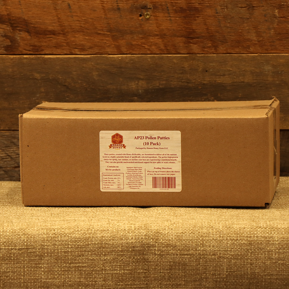 AP23 stands for artificial pollen and is the 23rd formulation to be developed and tested to date. This recipe is mixed with Honey-B-Healthy. It is formulated to deliver all of the nutrient levels, in a highly palatable blend of specifically selected ingredients. It is a high protein feed developed for all levels of beekeepers. It helps maintain colony strength by boosting populations, which result in better crop pollination and honey crops.