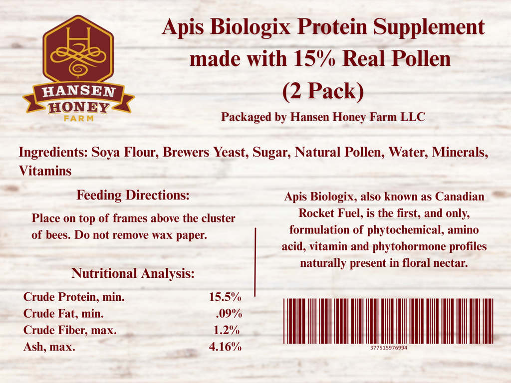 The original Global pollen patties, now made better with Apis Biologix! Apis Biologix, also known as Canadian Rocket Fuel, is the first, and only, formulation of phytochemical, amino acid, vitamin, and phytohormone profiles naturally present in floral nectar. Combined with a 15% Real Pollen patty, this is a feed that is convenient for you, and will be loved by your bees! Note: If not used within six months of purchase, it is best to freeze patties until next season to preserve the real pollen