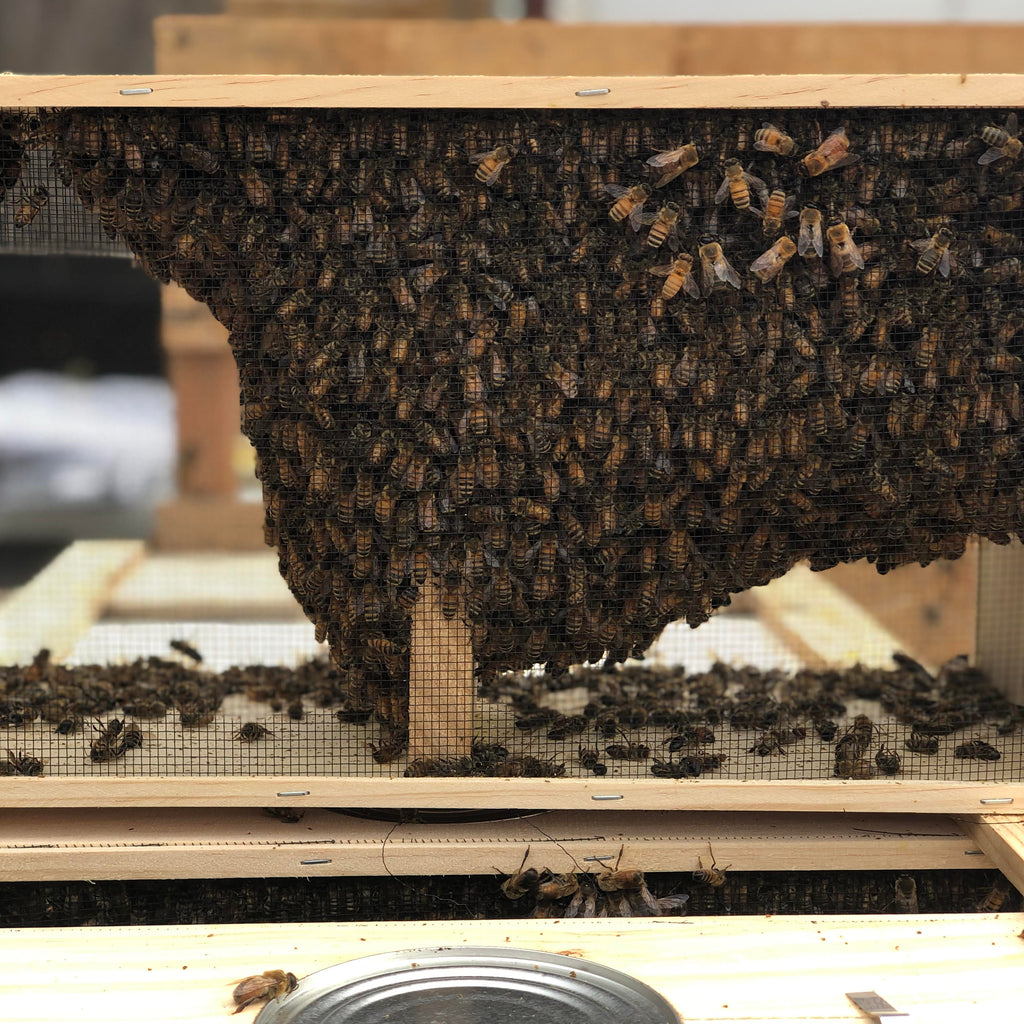 Package Bees are essentially a ready-made swarm, ideal for starting your hive in the spring. You will receive a wire or plastic cage with 3lbs of bulk honeybees, and 1 Queen Bee in her own mini cage within the cluster of bees. Once you pick up your bees, you will simply remove the feed can from the cage and shake the bees right into your hive.