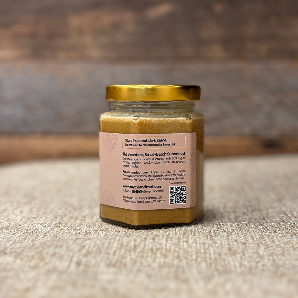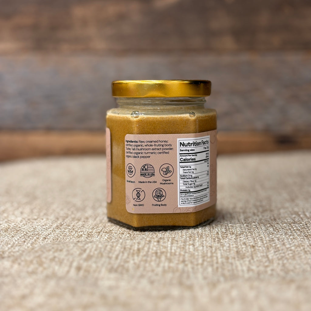 Embrace the ageless wisdom of nature with Longevity, a radiant blend of raw honey infused with certified organic Turkey Tail mushroom, turmeric, and black pepper. This golden elixir is like sunlight in a jar, nourishing your body. Turkey Tail mushrooms, turmeric and black pepper work together, creating a sweet yet spicy symphony of well-being.