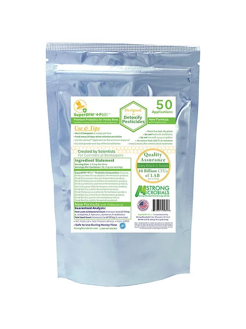 SuperDFM® empowers healthy digestion and optimal nutrient absorption. It replenishes the natural microbes lost due to agricultural modifications of the honey bee environment, such as pesticides, fungicides, and herbicides, which are all antimicrobial and destroy microbes that honeybees would naturally forage. The microbes in +P801™ have been scientifically shown to reduce chalkbrood, reduce pathogens, strengthen immunity, and activate the detoxification of pesticides, herbicides, and fungicides.